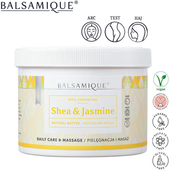 Természetes Jázmin és Shea vaj; teljes testmasszázshoz, különösen ajánlott száraz bőr ápolására és táplálására.