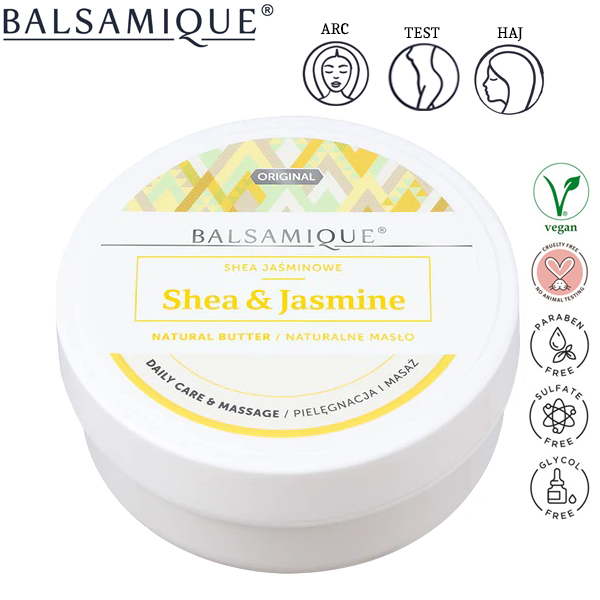 Természetes Jázmin és Shea vaj; teljes testmasszázshoz, különösen ajánlott száraz bőr ápolására és táplálására.